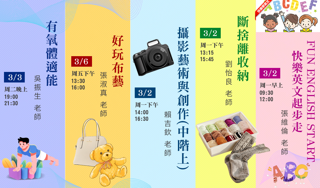 1280X750_六祖壇經1280X750_運動課程白天班課程1280X750_豆豆森林園藝新生活1280X750_A投資理財1280X750_A斷捨離1280X750_A好玩舒壓油畫棒1280X750_豆豆森林園藝新生活 |白天班課程推薦| 瘦身瑜珈506X338好玩舒壓油畫棒 好玩布藝好玩布藝 |113年「夏戀士林.芝蘭創生」教學成果展| |教室位置|臺北市士林區承德路四段190號3樓、192號3樓 |白天班|週一至週五 上午9:30至下午5:30 |連絡人|專線 (02) 2883-5780 黃執秘 |手機 0921-198-640