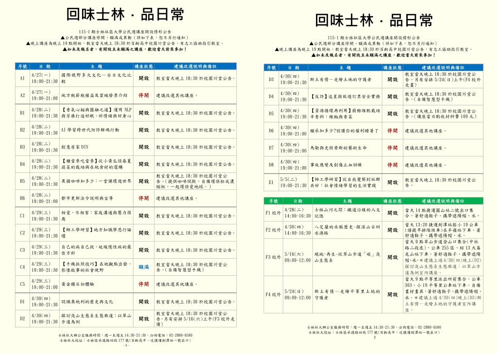 公民週部分講座停開、額滿或異動(詳如下表,恕不另行通知)晚上講座為晚上19點開始,教室當天晚上18:30於百齡高中校園川堂公告。如未及報名者,有開設且未額滿之講座,歡迎當天前來參加!