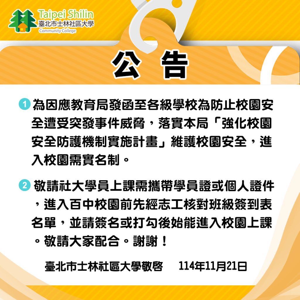 最新消息 遺失物招領公告 2025 年 11 月 24 日 有鑑於社大需招領失物日漸增加,故條列成清單公告招領,希望學員能領回失物! 以下為目前遺失物清單,有新遺失物品歡迎洽詢28806580 【公告】進入校園需實名制,上課需攜帶學員證或個人證件 2025 年 11 月 21 日 【士林社大公告】 1、為因應教育局發函至各級學校為防止校園安全遭受突發事件威脅,落實本局「強化校園安全防護機制實施計畫」维護校園安全,進入校園需實名制。 2、敬請社大學員上課需攜帶學員證或個人證件,進入百中校園前先經志工核對班級簽到表名單,並請簽名或打勾後始能進入校園上課。敬請大家配合。謝謝! 臺北市士林社區大學敬啟 114年11月21日 「重申」「重要公告」詐騙!勿入! 2025 年 11 月 19 日 近期接獲學員與老師收到士林社大FB山寨廣告與LINE私訊詐騙,請勿誤入受骗!社大無此課程! 士林社大並不會私訊要求付款!如有圖上詐騙勿入~ 正確社大資訊~ 服務地點:士林社大辦公室(百齡高中校區內) 服務時間:週一至週五14:30-20:30 洽詢電話:(02)2880-6580 上一頁 1 2 3 4 … 17 下一頁