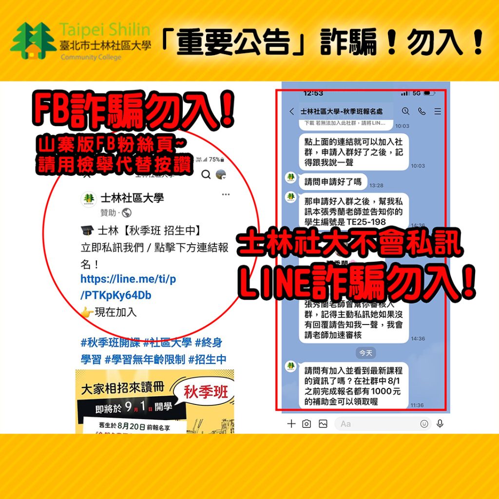 📣親愛的老師您好:近期接獲學員與老師收到士林社大FB山寨廣告與LINE私訊詐騙,請勿入受骗!